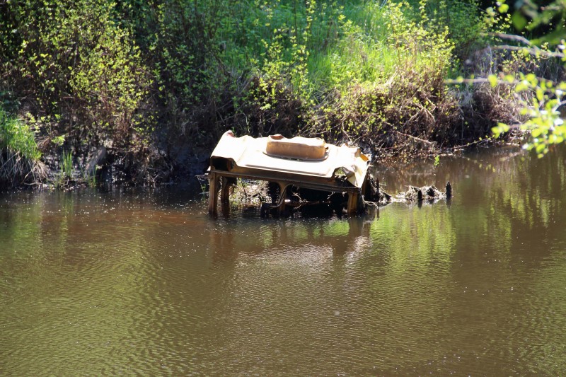 Собрали удочки, спиннинги, снасти и пр. и двинулись по тропе через болото. Вышли к реке, у противоположного берега которой торчал из воды кусочек трактора.