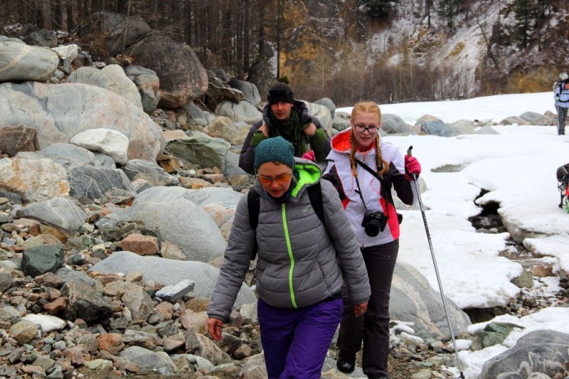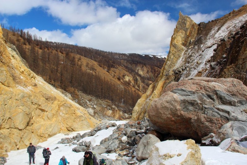 Дальше мы сходили с Белого Иркута направо на речку Мугувек, которая не задолго до впадения в Белый Иркут, в ложбине образует зимой ледник. В этом году нам повезло, ледник слегка подтаял, и можно было без особых проблем идти по нему без кошек, которых у нас собственно и не было. Облака немного стали расходиться, идти стало веселее.