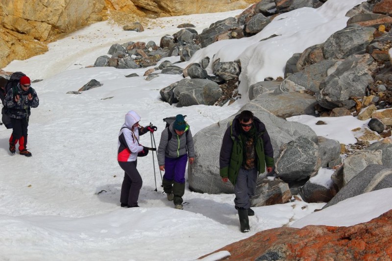 Примерно посредине ледника, Маша отказалась идти дальше и собиралась уже было идти назад, но Женя с Катей ее не отпускали. Мне сказали, чтобы не ждал, они отдохнут и догонят.