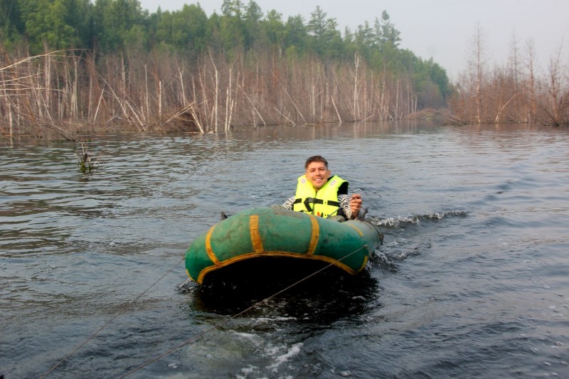 Мы накачали катамаран, долго соображали, надо ли в бензин добавлять масло, мотор вроде двухтактный, значит, вроде как надо, остался вопрос — сколько надо добавлять, на глазок прикинули, и походу с маслом переборщили. Прошли по затопленной дороге до открытой воды, а тут блин волна, захлестывает на катамаран и жопы мочит. Вернулись назад к УАЗику. Народ собрал спиннинги, снасти, поплыли рыбачить. А мы с Серегой решили попробовать проехать до бывшей деревни Ёдармы, ее самой, правда, уже нет, но кусочек места из под нее остался.