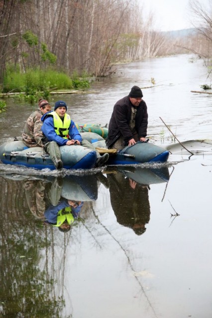 Наконец вышли на воду, на берегу остался Андрюха, нас четверо на катамаране, и сзади привязали лодку, чтоб когда дойдем до места, туда выгнать Паху, т.к. он единственный в забродниках, а у лодки дно пропускает.