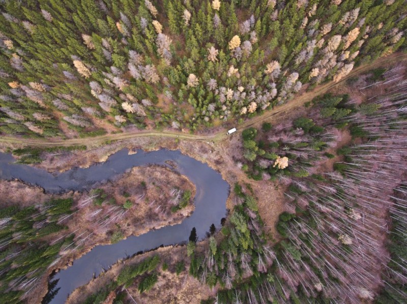 Решил попробовать вчерашний аккумулятор, он сначала тоже поругался, на холод. После отогревания, отказался взлетать, потому как осталось мало заряда (около 40%). Завел УАЗик, включил преобразователь, поставил его на зарядку. Немного подзарядился, взлетел, сначала метров на пять, подождал – вроде нормально, полетел выше, но все равно далеко в сторону и высоко запускать не стал, хватит на сегодня двух аварийных посадок, а то еще придется его искать хрен знает где в тайге.